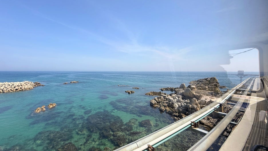 👉 추천 컷 : 레일 위를 달리는 모노레일과 푸른 바다를 함께 담기