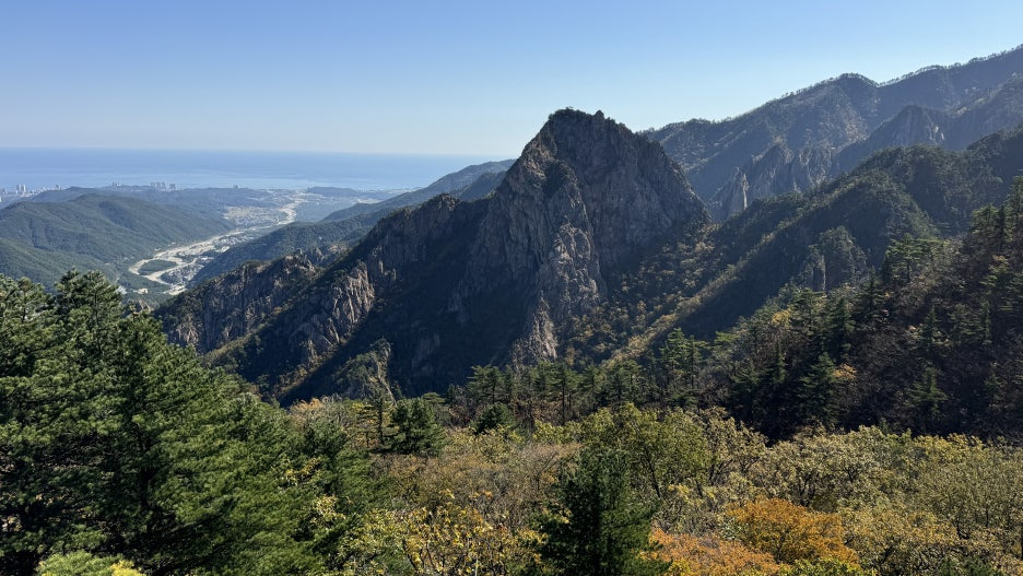 - 바위 아래로 펼쳐진 단풍과 속초 시내가 어우러진 풍경