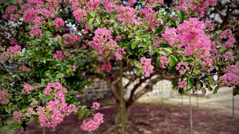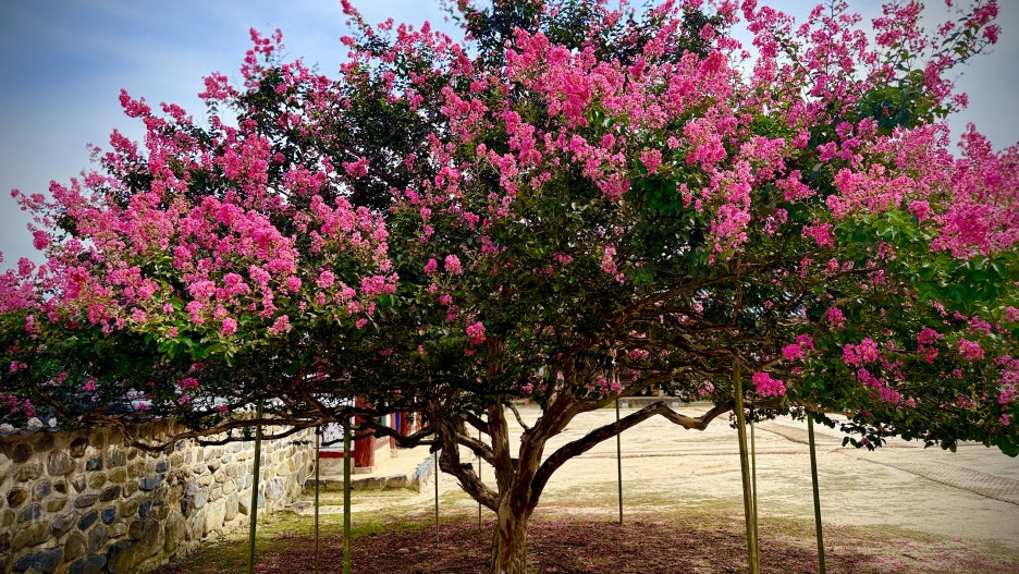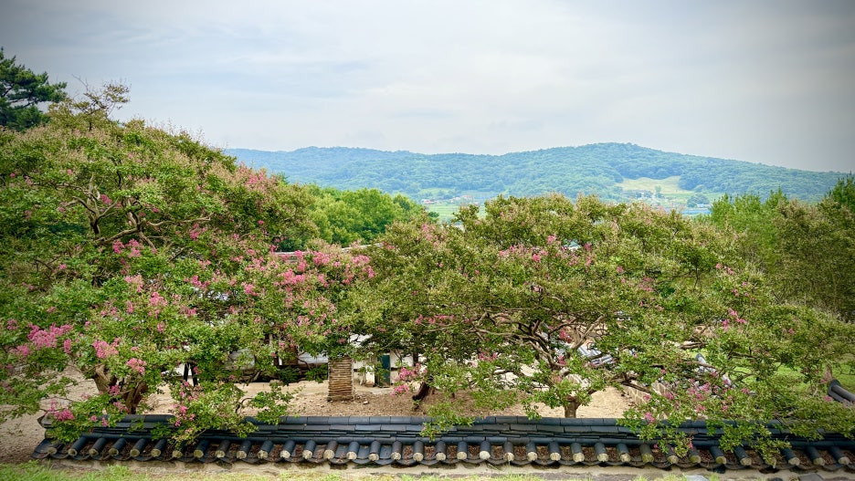 담장 너머로 보이는 배롱나무는 단아한 한옥과 어우러져 고풍스러운 정취를 더합니다. 나무껍질이 벗겨진 매끈한 줄기와 진분홍 꽃송이들이 대비를 이루며 고요한 미학을 선사합니다.
