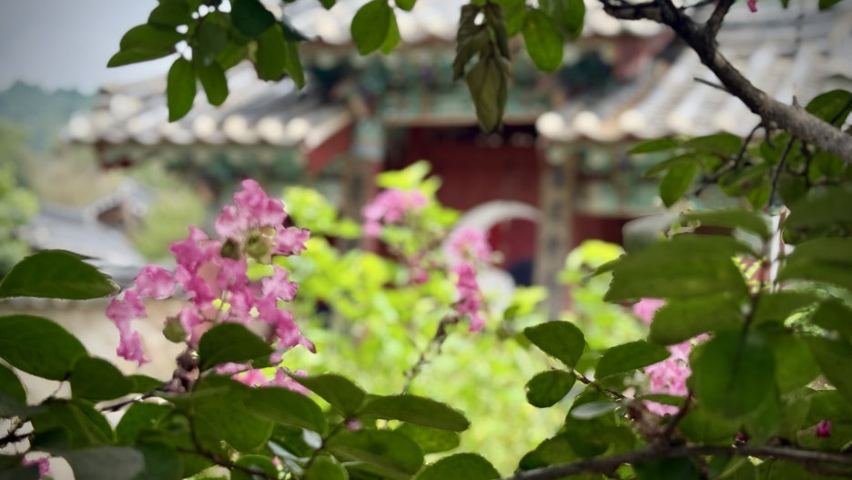 정오의 강한 햇빛은 색을 날카롭게 만들지만, 이른 시간의 햇살은 기와의 질감과 배롱나무의 분홍빛을 은은하게 살려줍니다. 빛이 사선으로 들어올 때 담벼락과 꽃 그림자가 길게 드리우는데, 이때 하단 앵글로 살짝 올려다보며 촬영하면 하늘과 꽃, 기와가 한 프레임에 들어옵니다.